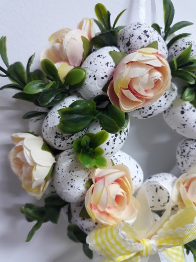 - Piękny dekoracyjny wianek ze styropianowymi jajkami, przyozdobiony gałązkami bukszpanu, peoniami oraz ozdobną kokardą.