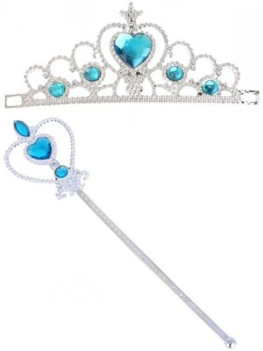 Zestaw - korona i różdżka w kolorze srebrnym z niebieskimi dodatkami