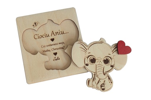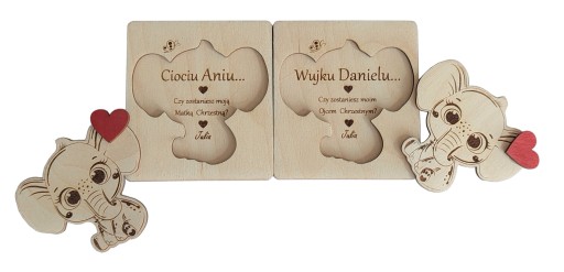Drewniana kartka - pytanie, zostaniesz moją matką chrzestną, ojcem chrzestnym.