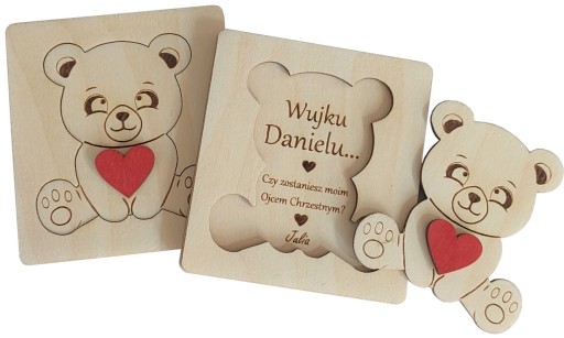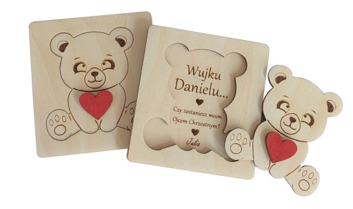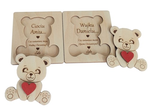 Drewniana kartka - pytanie, zostaniesz moją matką chrzestną, ojcem chrzestnym.