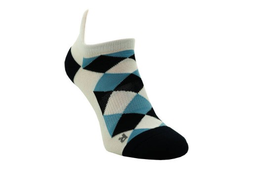 Uniwersalne skarpety w kolorze białym dla kobiet i mężczyzn (unisex). Długość do kostki. Ponadczasowy wzór w romby w granatowym kolorze.