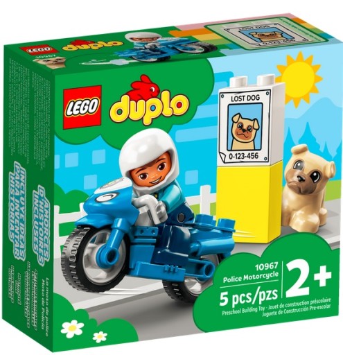 Zabawna misja policyjna — zestaw do składania LEGO® DUPLO® Rescue Motocykl policyjny (10967) to gratka dla każdego przedszkolaka zainteresowanego pracą policji, fajnymi motocyklami albo opieką nad zwierzętami.