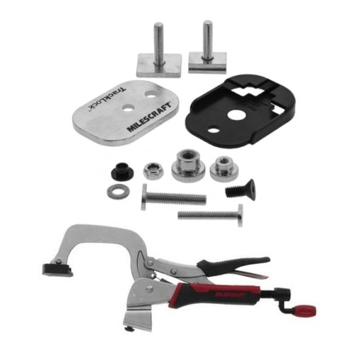 TrackMaster od Milescraft to zestaw akcesoriów do montażu w profilach T-track i Miter Track z dosiskiem BenchClamp 80mm.