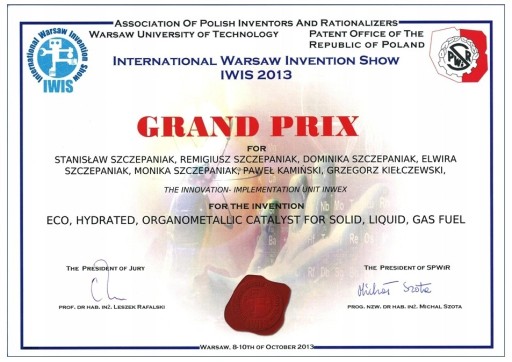 Powyższe rozwiązanie na Warszawskiej Międzynarodowej Wystawie Wynalazków IWIS 2013 zdobyło: nagrodę GRAND PRIX, THE IFIA GLORY MEDAL oraz CERTIFICATE APPRECIATION od IFIA na Drugim Światowym Konkursie