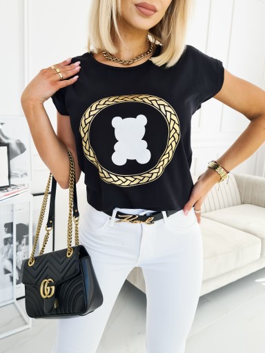 Z przodu złoty, metaliczny nadruk z misiem, niezwykle stylowy.