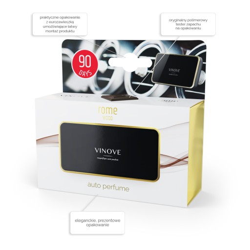 VINOVE jest nową marką perfum samochodowych, stworzonych przez polskich pasjonatów we współpracy z francuskimi mistrzami sztuki perfumeryjnej i włoskimi projektantami oraz naukowcami. VINOVE to ekskluzywne perfumy samochodowe. Do produkcji perfum samochodowych VINOVE zastosowano technologię XXI wieku. Wykorzystano wiedzę, otwartość i doświadczenie zespołu naukowców i wspólnie z nimi skondensowano zapachy w nowatorskim polimerze. Ich kształt jest tak skonstruowany, by powietrze z wywietrzników samochodowych delikatnie opływało polimerowy labirynt, uwalniając zapach subtelnie i długotrwale – aż do 90 dni. Projektując nośnik zapachu wzięto pod uwagę przede wszystkim jego walory użytkowe: długotrwałość uwalniania zapachu, bezpieczeństwo dla tapicerki i kokpitu samochodu, a także ekskluzywny wygląd, współgrający ze stylistyką nowoczesnych aut.