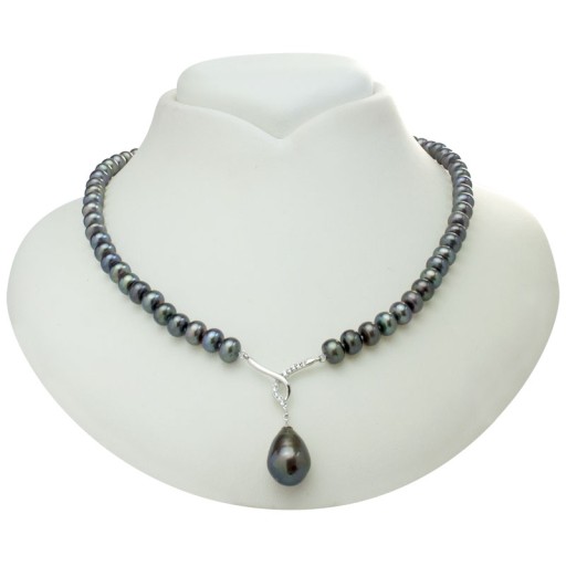 Popularny wzór naszyjnika z pereł w połączeniu z ozdobną zawieszką. Błyszcząca srebrna zawieszka jest główną dekoracją tego subtelnego naszyjnika. Ozdobiona została sporą owalną perłą o średnicy około 10,0-11,0 milimetrów, a na jej powierzchni osadzone zostało dziesięć cyrkonii które nadają jej blasku. Perły o bardzo ładnym połysku i gładkiej powierzchni idealnie współgrają z zawieszką.