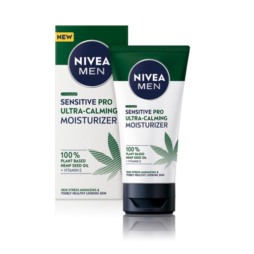 NIVEA® MEN SENSITIVE PRO Ultra-Calming krem nawilżający 24h z 100% organicznym olejem z nasion konopnych i witaminą E. Przynosi natychmiastowe nawilżenie i odprężenie napiętej oraz zestresowanej skórze.