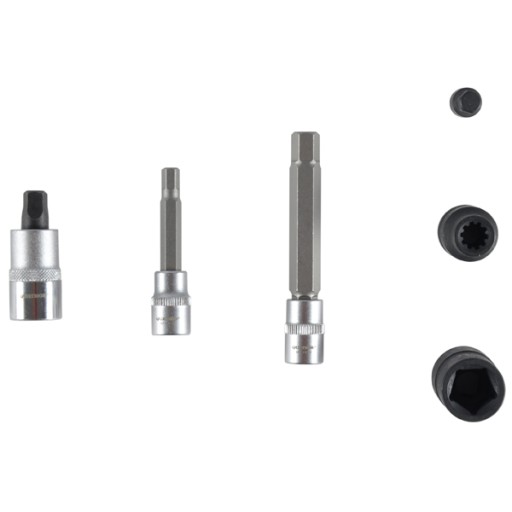 Zestaw zawiera 17 sztuk nasadek i zestaw bitów do demontażu zacisków hamulcowych podczas wymiany klocków hamulcowych.