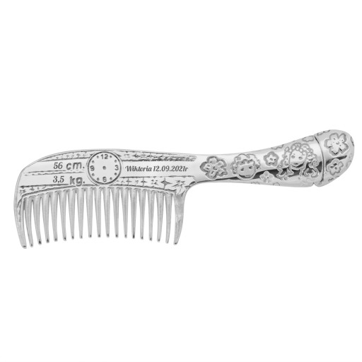 Grzebyk w całości jest wykonany ze srebra o próbie 925. Zdobią go maleńkie kwiatki oraz uśmiechnięte twarze dzieci. Jednak to co nadaje mu charakter pamiątki, to malutka tarcza zegara, na której można umieścić grawerowane wskazówki zegara, pokazujące godzinę narodzin dziecka. Obok zostało wyznaczone miejsce na wygrawerowanie wagi i wzrostu dziecka oraz jego imienia. Taką pamiątkę przechowuje się przez całe życie, a z biegiem lat staje się ona coraz cenniejsza.