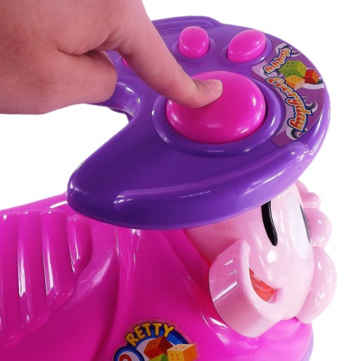- Jeździk posiada dużą kierownicę. W kierownicy ma przyciski z dźwiękami, które uatrakcyjnią zabawę.