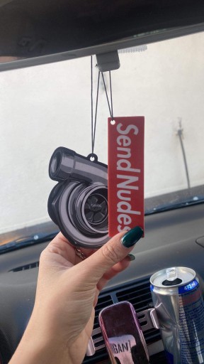 Zawieszka zapachowa do samochodu Boobs Out posiada zapach New Car oraz wyjątkową, obustronną grafikę.