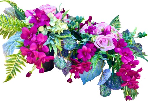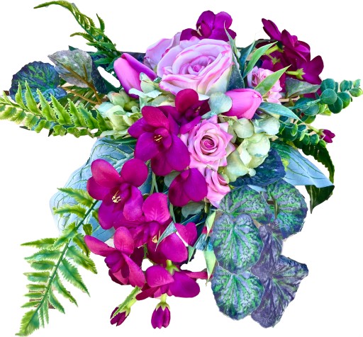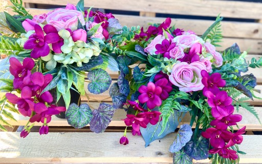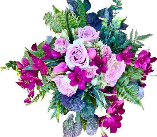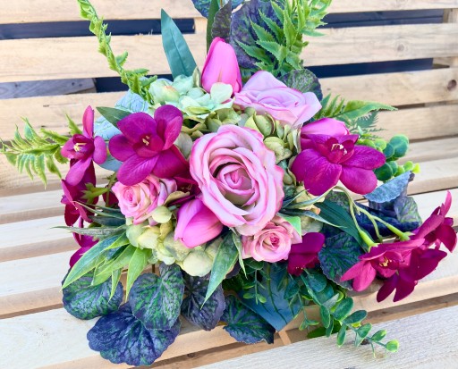 W skład wiązanki i bukietu wchodzi zestaw pięknych sztucznych kwiatków w odcieniach różu i fioletu, które doskonale imitują żywe kwiaty: