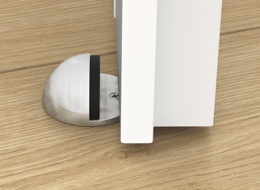 Odbojnik, stoper o kształcie półkuli z elementem gumowym amortyzującym uderzenia drzwi. Wykonany z metalu ZnAl (stop cynku i aluminium) i gumy. Montaż jest szybki i stabilny - odbojnik jest przykręcany do podłogi za pomocą załączonych w zestawie elementów montażowych - kołek rozporowy. Posiada sworzeń, który zapobiega obracaniu się odbojnika na podłodze.