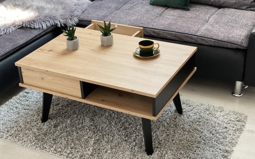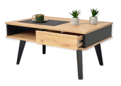 Nowoczesny stolik kawowy RUMBA III z ukrytą szyfladą w stylu loftowym z drewnianymi nóżkami będzie niewątpliwie ozdobą każdego mieszkania.