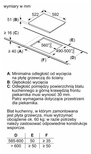 - Wymagane wymiary montażowe wnęki (WxSxG mm) : 51 x 560 x (490 - 500)