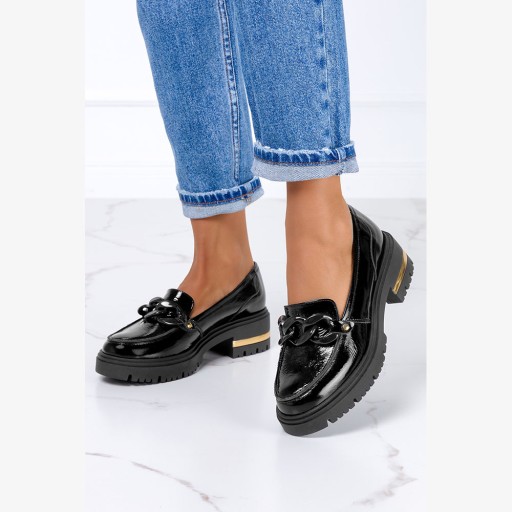 Czarne mokasyny lakierowane półbuty na platformie z łańcuchem POLSKA SKÓRA Casu 4075-2
