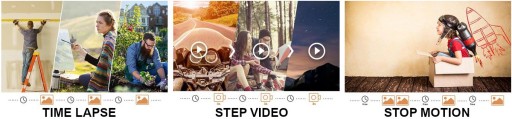 3. Stop Motion - ręczny tryb poklatkowy - użytkownik "pstryka" zdjęcia - kamera montuje to w jeden film.