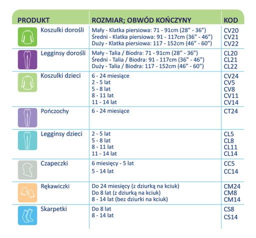 - Legginsy Comfifast™ Easywrap™ (nastolatki i dorośli), dostępne są w 3 wariantach rozmiarowych: Małe (talia/biodra: 71-91cm), Średnie (talia/biodra: 91-117cm) i Duże (talia/biodra: 117-152cm). Wszystkie dostępne warianty rozmiarów można obejrzeć w zamieszczonej poniżej tabeli rozmiarów.