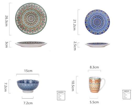 4 miseczki o średnicy 15cm, wysokości 7,2cm oraz pojemności 650ml.