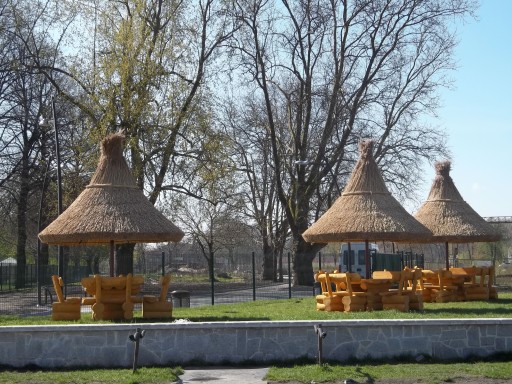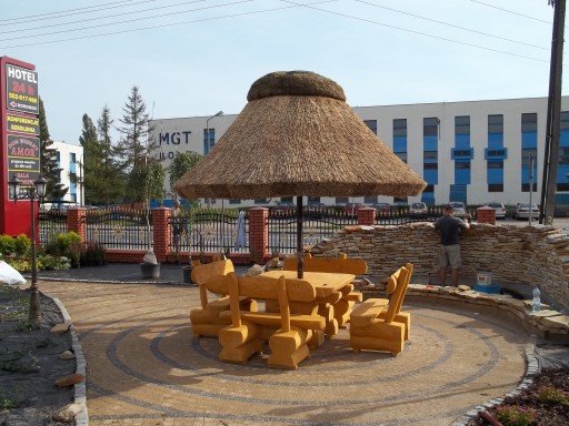 - Do parasola proponuję meble z grubych bali przycinane i łączone taką metodą, jak domy w Kanadzie. Meble kosztują 4000 zł ( stół 120 x 120 cm oraz 4 ławki o długości 120 cm.) Jest to komplet mebli na 8 dorosłych osób.
