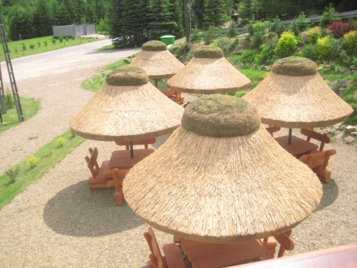 - Mebli ani parasola na zimę nie przykrywamy i nie chowamy. Spadek trzciny gwarantuje szybkie obsychanie, a meble są z grubych bali łączone tak, jak domy w Kanadzie, przetrwają wiele wiele lat wszystkie zawieruchy i opady.