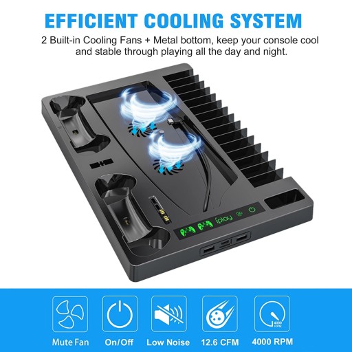 W zestawie dwa wysokowydajne wentylatory chłodzące wyłączane przyciskiem, według potrzeb. Popraw żywotność swojej konsoli PS5