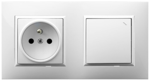 ZESTAW WŁĄCZNIK SCHODOWY I GNIAZDO POJEDYNCZE ARIA W KOLORZE BIAŁYM Z RAMKĄ PODWÓJNĄ. MONTOWANE W STANDARDOWYCH PUSZKACH FI60 ŁĄCZONYCH.
