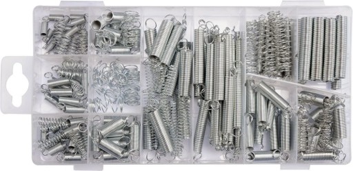 Zestaw sprężynek zawierający 200 różnych rozmiarów. Sprężynki pracujące zarówno na ściskanie, jak i rozciąganie. Całość umieszczono w wygodnym opakowaniu typu "sortownik".