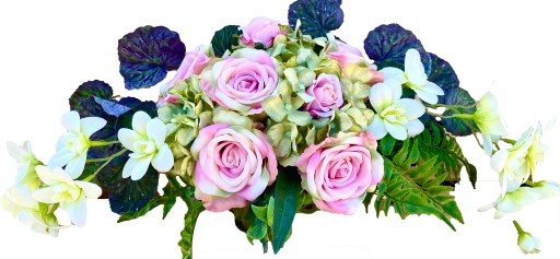 W skład stroiku wchodzi zestaw pięknych, sztucznych kwiatków w odcieniach różu i fioletu, które doskonale imitują żywe kwiaty: