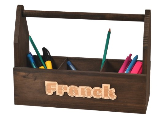 Drewniany organizer z imieniem na przybory w kolorze brązowym umożliwia eleganckie przechowywanie różnorodnych przedmiotów takich jak przybory szkolne lub kredki w pokoju Twojego dziecka. Dobrze zorganizowana przestrzeń na biurku usprawni naukę oraz odrabianie lekcji. Przybornik drewniany posiada 3 przegrody,które pozwolą na utrzymanie porządku a zarazem pokój ucznia staje się ładny i funkcjonalny.