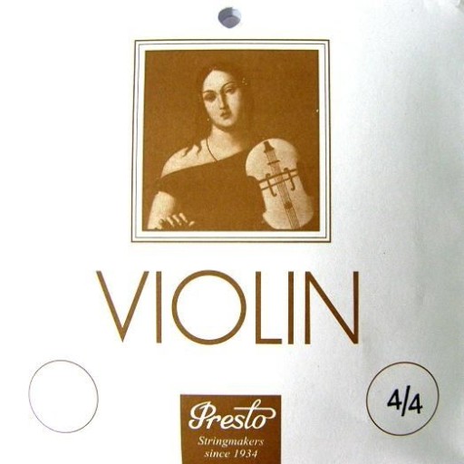 Presto Violin struny skrzypcowe 4/4 Struny wykonane na rdzeniu stalowym ze specjalnie dobieranym współczynnikiem rozciągliwości i stałości drgań harmonicznych na całej długości rdzenia. Struna E zrobiona jest z powlekanej srebrem stali, natomiast pozostałe struny posiadają wielowarstwowy oplot wewnętrzny z przędzy jedwabnej, poliamidowej, warstwy oplotu z metali kolorowych i szlachetnych oraz zewnętrzną owijkę ze specjalnie profilowanej i szlifowanej taśmy ze szlachetnego stopu (chrom, nikiel, srebro). Są to struny średniej twardości, które zapewniają nośny dźwięk o ciepłej barwie, zaś precyzja wykonania zapewnia dobrą klarowność dźwięku i właściwe kwintowanie we wszystkich pozycjach. • Do skrzypiec 4/4 • Naciąg: medium
