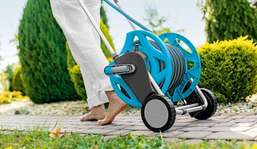 - Wbijane nóżki zapewniające stabilność wózka w trakcie rozwijania węża