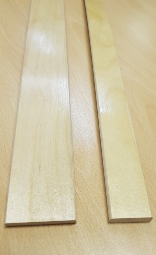 Przedmiotem oferty są 2 wąskie listwy sprężynujące, brzozowe o wymiarach 800x35x8 mm, w zestawie z 2 uchwytami/kieszonkami służącymi do ich mocowania na stelażu.