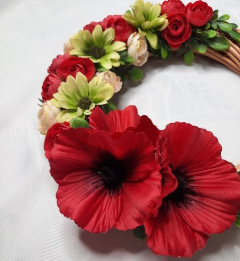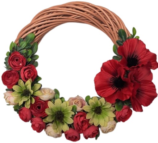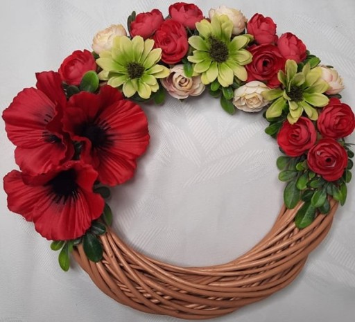 Prezentujemy śliczny wianek wiklinowy ozdobiony pięknymi sztucznymi kwiatami. Wianek został ozdobiony wysokiej jakości sztucznymi kwiatami w pięknych nasyconych kolorach. Ozdoba została wykonana ręcznie z najwyższą starannością.