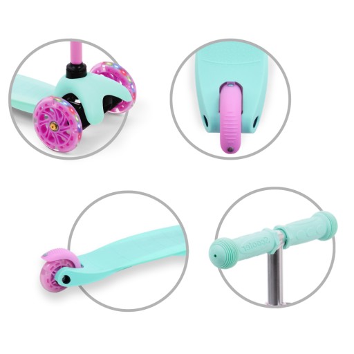 - Materiały: Aluminiowa kierownica, plastikowy podest, poliuretanowe koła z diodami LED