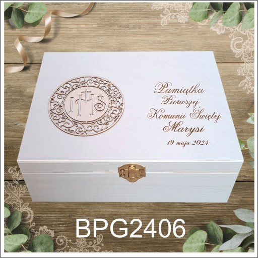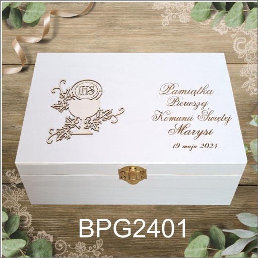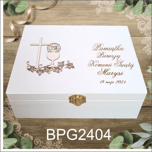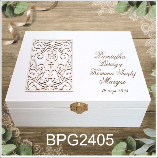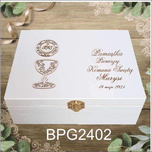 Aby podkreślić wyjątkowy charakter pudełka dodatkowo wygrawerujemy na nim imię dziecka i datę uroczystości.