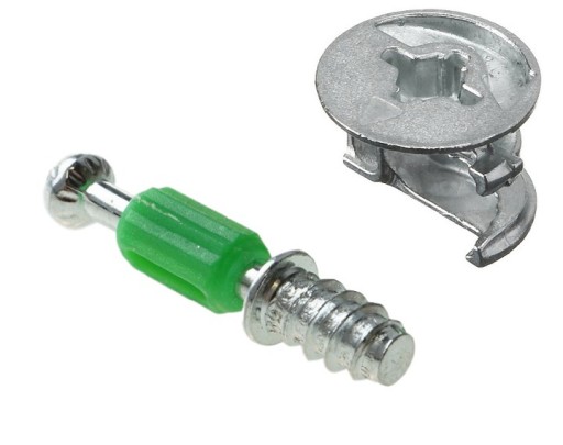 Montaż dokonuje się poprzez wywiercenie otworu Ø 15 mm, w płycie którą chcemy połączyć oraz otworu na trzpień o średnicy 7,5 mm, następnie dokonujemy montażu trzpienia w dolnej części bezpośrednio w płytę lub drewno dla gwintu euro, dla gwintu M6 należy dokupić mufę tworzywową lub metalową, dla trzpienia wbijanego wciskamy w otwór fi 8. Po montażu trzpienia zakładamy mimośród w otwór fi 15 i dokonujemy jego przekręcenia w celu złączenia 2 elementów.