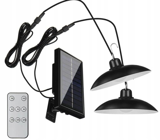 - Estetyczna, wisząca lampa ogrodowa (żyrandol) ( ZESTAW DWIE z czujnikiem zmierzchu. W zestawie uniwersalny uchwyt służący do zamocowania na płocie, dachu czy elewacji. Wyposażona w jasne i energooszczędne diody LED, zasilane z wbudowanego akumulatora oraz panelu słonecznego. Nie wymaga dodatkowych źródeł zasilania. Odpinany moduł z panelem solarnym oraz długi kabel pomiędzy lampą umożliwia zawieszenie panelu solarnego w lepiej nasłonecznionym miejscu niż sama lampa. Pilot zdalnego sterowania IR umożliwia wygodną obsługę lampy.