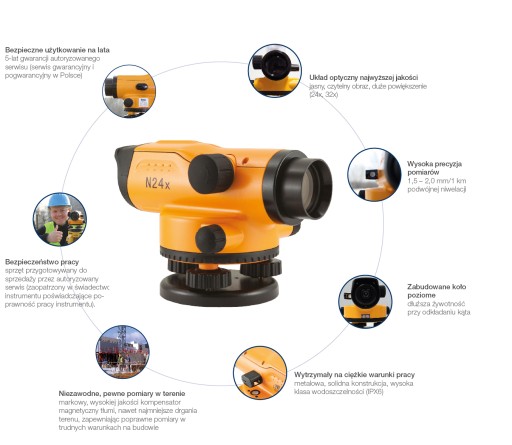 Niwelator optyczny Nivel System N32x to instrument do bardzo precyzyjnych pomiarów różnic wysokości. Niwelator wyposażono w wysokiej jakości optykę gwarantującą bardzo dobrą jakość obrazu (czytelny obraz). Magnetyczny kompensator umożliwia wykonywanie pomiarów na terenach niestabilnych, gdzie statyw z niwelatorem mogą być narażone na ciągłe drgania. Instrument jest odporny na pył i wodę, co umożliwia pracę w ciężkich warunkach – podczas deszczu czy w środowisku mocno zapylonym. Niwelator przeznaczony jest dla specjalistów, którzy wymagają od instrumentu pomiarowego najwyższej precyzji i niezawodności, m.in. dla geodetów, drogowców, budowlańców, archeologów.