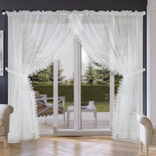 Brzegi firanki wykończone są piękną gipiurą oraz lamówką. U góry znajduje się taśma marszcząca, umożliwiająca zawieszenie na karniszu rurkowym.