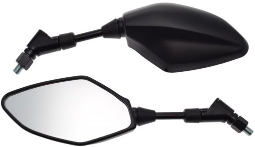 Czarne matowe lusterka o nowoczesnym designie. Mocowane są na solidnym metalowym uchwycie o średnicy gwintu 10 mm. Posiadają możliwość przegubowej regulacji kąta widzenia, dzięki której możliwe jest indywidualne dopasowanie ustawień do własnych potrzeb. Wyposażone są w otwory umożliwiające odprowadzanie wody.
