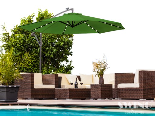 Parasol ogrodowy na wysięgniku z diodami LED i stojakiem wykonany z wysokiej jakości materiałów z korbką do łatwego i wygodnego rozkładania. Diody LED ładują się za pomocą płytki solarnej dlatego nie potrzeba dodatkowego zasilania z instalacji elektrycznej. Parasol jest odporny na warunki atmosferyczne i promieniowanie UV. Bardzo łatwy i wygodny sposób rozkładania i składania za pomocą korbki. Łatwy do przechowywania. Górna część parasola posiada otwór wentylacyjny, który zapewnia cyrkulację powietrza.