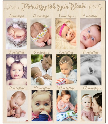Drewniana Tablica z ramki na zdjęcia. Wspaniała pamiątka z pierwszego roku życia dziecka.