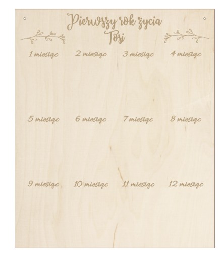 Grafiki, tekst na tablicy jest grawerowany. Możemy umieścić dowolny tekst np. Roczek (imię dziecka), Pierwszy rok życia (imię dziecka).