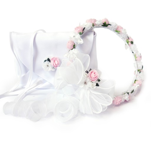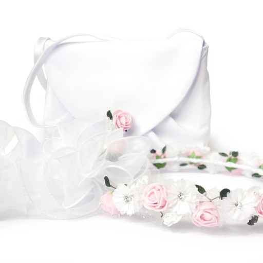 Oferujemy zestaw komunijny dla dziewczynki: TOREBKA + WIANEK. Cena obejmuje oba te produkty: torebka z ozdobą oraz wianuszek komunijny do kompletu.