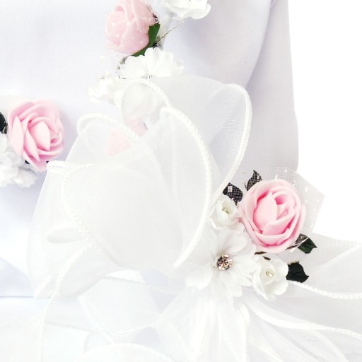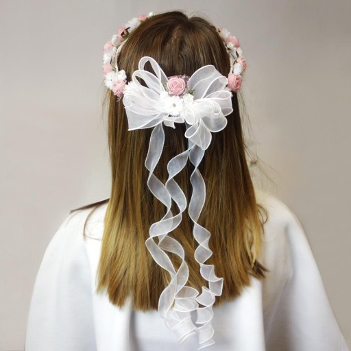 WIANEK wykonany jest z tworzyw sztucznych. Składa się z różowych różyczek i białych kwiatuszków z dodatkiem zielonych listeczków oraz połyskujących cyrkonii. Z tyłu wianka upięta jest śliczna kokarda, z której wychodzą 3 kręte tasiemki opadające wzdłuż włosów.
