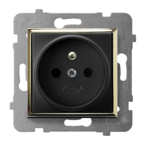 ZESTAW GNIAZDO POJEDYNCZEARIA W KOLORZE CZARNYM Z OBRAMÓWKĄ ZŁOTĄ. MONTOWANE W STANDARDOWYCH PUSZKACH FI60. NIE POSIADA RAMKI ZEWNĘTRZNEJ.