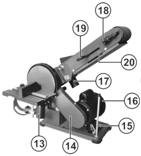 - 15. Ogranicznik położenia ramienia taśmy szlifującej.