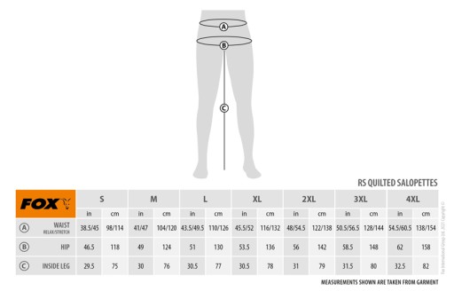 Fox - Pikowane spodnie ogrodniczki, które doskonale zapewnią Ci ciepło w zimie - Zaprojektowane do noszenia wraz z kurtką Fox Camo/Khaki RS Jacket - Kolor Khaki z panelami Fox Camo - Zapinane na zamek kieszenie - Wzmocnione panele na siedzeniu i kolanach - Zamki przy kostkach z dostępem do butów - Elastyczne, regulowane szelki - Przypominająca puch izolacja termiczna z poliestru - Konstrukcja pikowana - Zewnętrzna warstwa z materiału poliestrowego rip-stop - Materiał zewnętrzny: 100% poliester, Wypełnienie: 100% poliester, Podszycie: 100% poliester